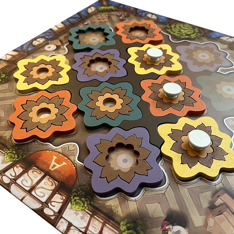Intarsia é um jogo estratégico onde os jogadores competem para criar o piso mais bonito de uma cafeteria, posicionando peças de madeira para formar padrões e marcar mais pontos.